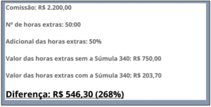 Sem a Súmula, o valor das horas extras foi de R$ R$ 750,00 e com a aplicação da Súmula foi de R$ 203,70, ou seja, uma diferença de 268% (duzentos e sessenta e oito por cento).